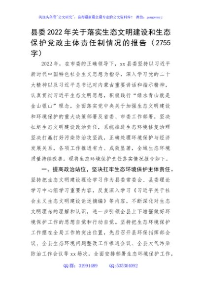 / 县委2022年关于落实生态文明建设和生态保护党政主体责任制情况的报告