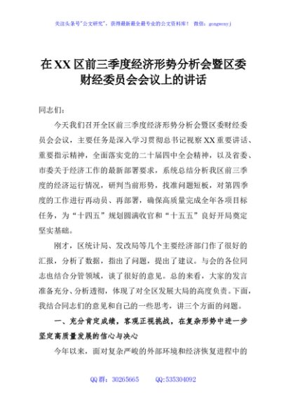 / 在XX区前三季度经济形势分析会暨区委财经委员会会议上的讲话