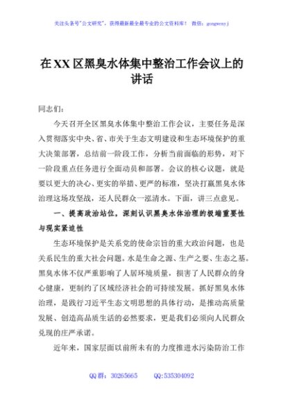 / 在XX区黑臭水体集中整治工作会议上的讲话