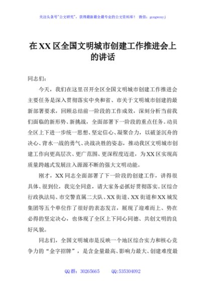 / 在XX区全国文明城市创建工作推进会上的讲话