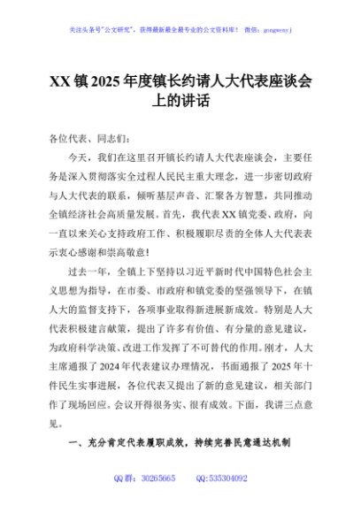 / XX镇2025年度镇长约请人大代表座谈会上的讲话