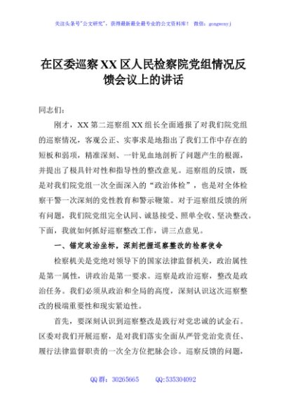 / 在区委巡察XX区人民检察院党组情况反馈会议上的讲话