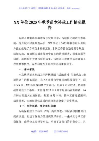 / XX单位2025年秋季苗木补栽工作情况报告