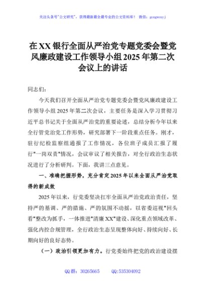 / 在XX银行全面从严治党专题党委会暨党风廉政建设工作领导小组2025年第二次会议上的讲话