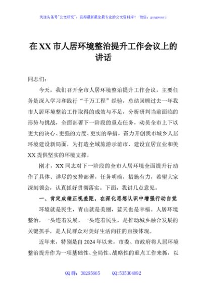 / 在XX市人居环境整治提升工作会议上的讲话