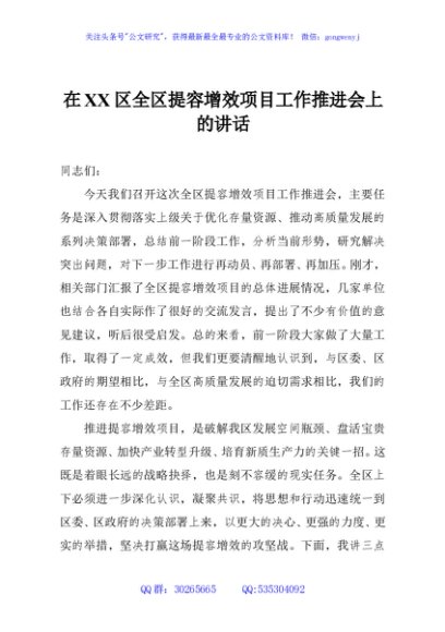 / 在XX区全区提容增效项目工作推进会上的讲话