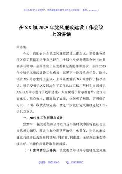 / 在XX镇2025年党风廉政建设工作会议上的讲话