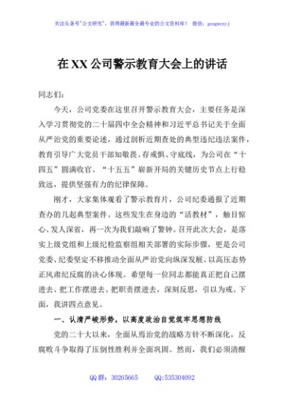 / 在XX公司警示教育大会上的讲话