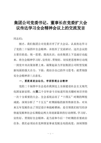 / 集团公司党委书记、董事长在党委扩大会议传达学习全会精神会议上的交流发言
