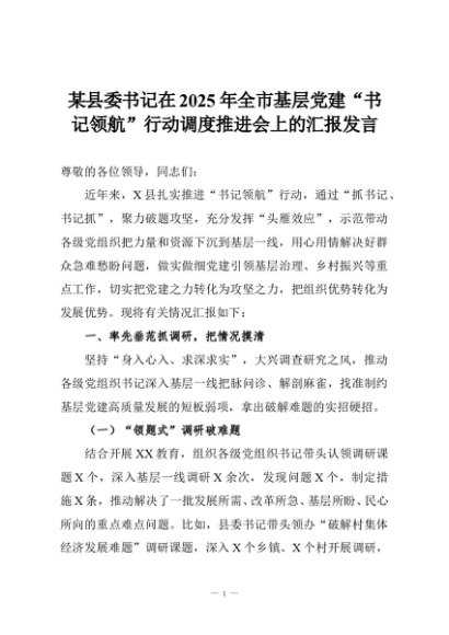 / 某县委书记在2025年全市基层党建“书记领航”行动调度推进会上的汇报发言
