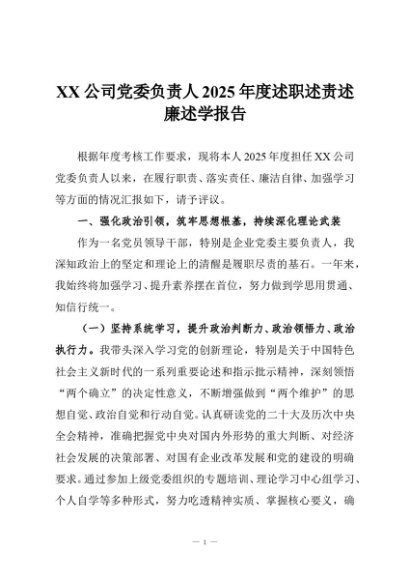 / XX公司党委负责人2025年度述职述责述廉述学报告
