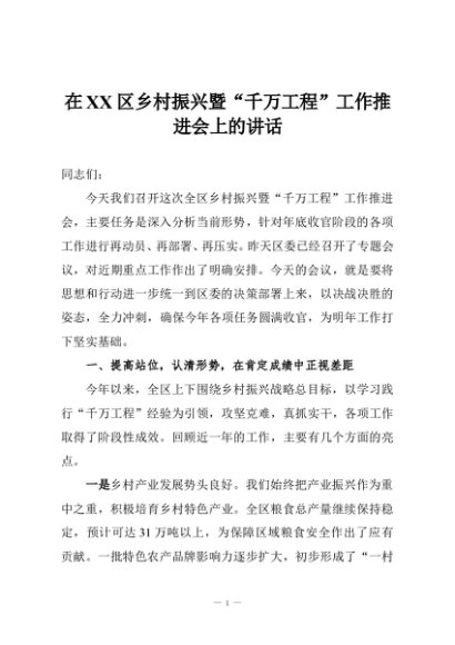 / 在XX区乡村振兴暨“千万工程”工作推进会上的讲话