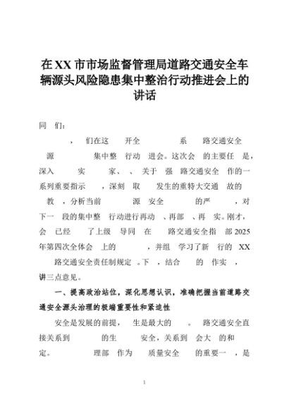 / 在XX市市场监督管理局道路交通安全车辆源头风险隐患集中整治行动推进会上的讲话