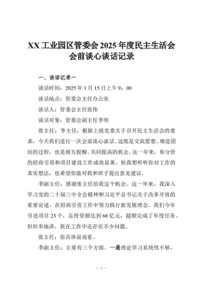 / XX工业园区管委会2025年度民主生活会会前谈心谈话记录