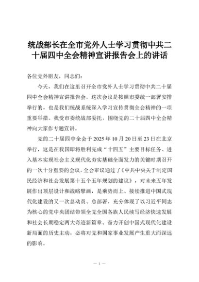 / 统战部长在全市党外人士学习贯彻中共二十届四中全会精神宣讲报告会上的讲话