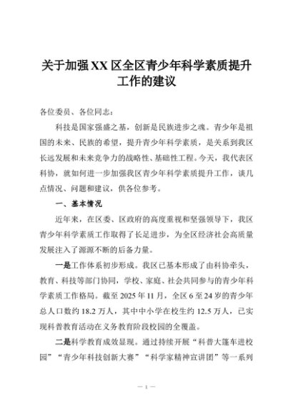 / 关于加强XX区全区青少年科学素质提升工作的建议