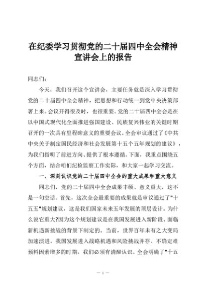 / 在纪委学习贯彻党的二十届四中全会精神宣讲会上的报告