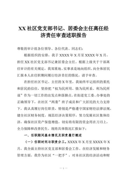 / XX社区党支部书记、居委会主任离任经济责任审查述职报告