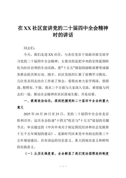 / 在XX社区宣讲党的二十届四中全会精神时的讲话