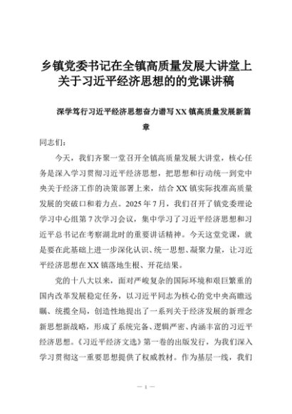 / 乡镇党委书记在全镇高质量发展大讲堂上关于习近平经济思想的的党课讲稿