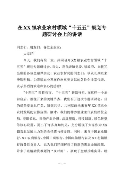 / 在XX镇农业农村领域“十五五”规划专题研讨会上的讲话