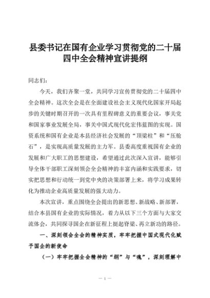 / 县委书记在国有企业学习贯彻党的二十届四中全会精神宣讲提纲