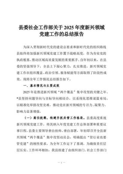 / 县委社会工作部关于2025年度新兴领域党建工作的总结报告