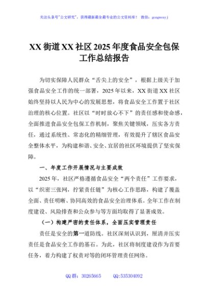 / XX街道XX社区2025年度食品安全包保工作总结报告