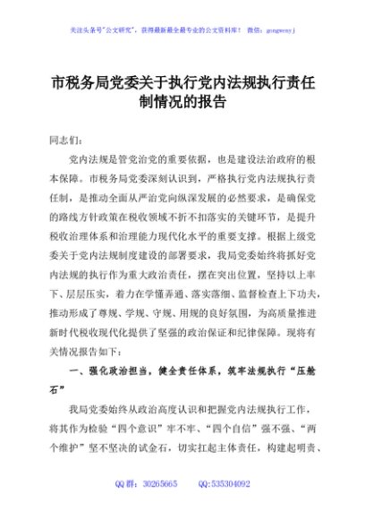 / 市税务局党委关于执行党内法规执行责任制情况的报告