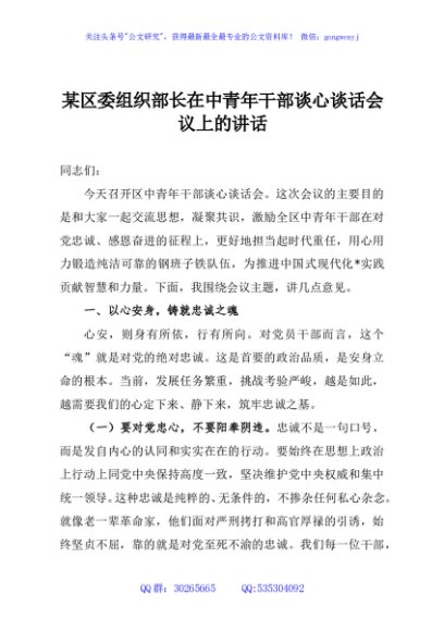 / 某区委组织部长在中青年干部谈心谈话会议上的讲话