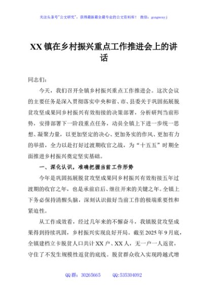/ XX镇在乡村振兴重点工作推进会上的讲话