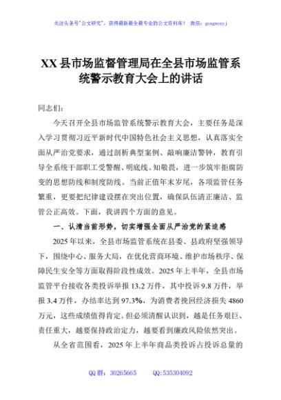 / XX县市场监督管理局在全县市场监管系统警示教育大会上的讲话