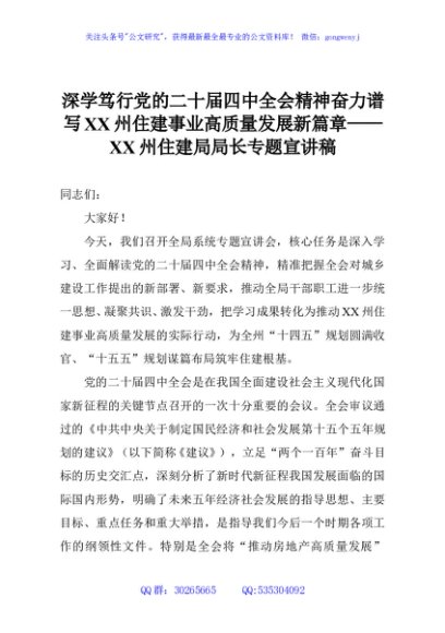 / 深学笃行党的二十届四中全会精神奋力谱写XX州住建事业高质量发展新篇章——XX州住建局局长专题宣讲稿