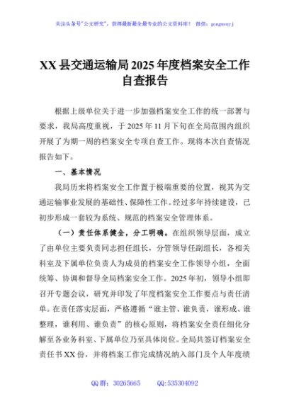 / XX县交通运输局2025年度档案安全工作自查报告