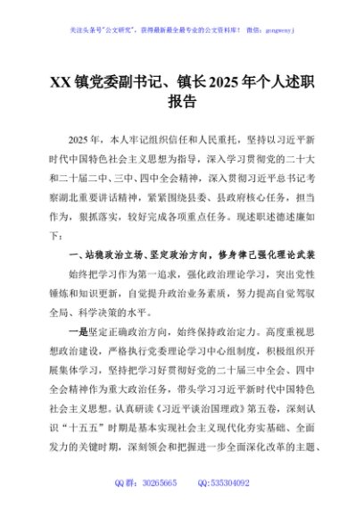 / XX镇党委副书记、镇长2025年个人述职报告