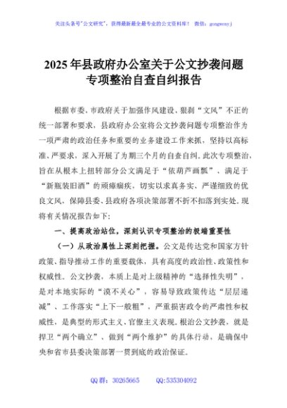 / 2025年县政府办公室关于公文抄袭问题专项整治自查自纠报告