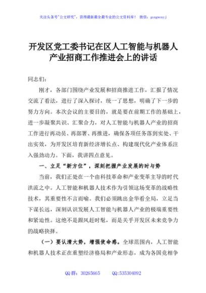 / 开发区党工委书记在区人工智能与机器人产业招商工作推进会上的讲话