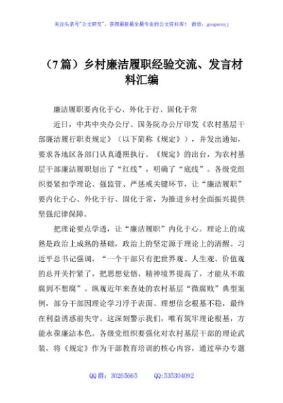 / (7篇)乡村廉洁履职经验交流、发言材料汇编
