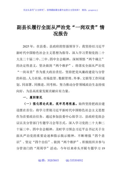 / 副县长履行全面从严治党“一岗双责”情况报告