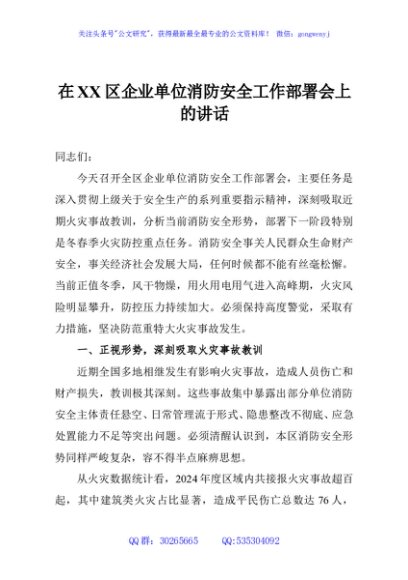 / 在XX区企业单位消防安全工作部署会上的讲话