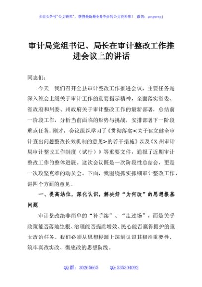 / 审计局党组书记、局长在审计整改工作推进会议上的讲话