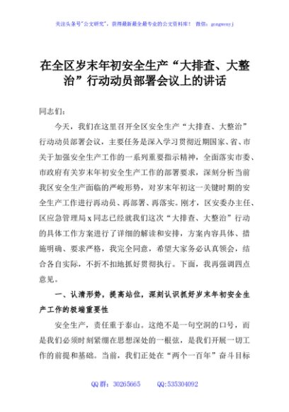 / 在全区岁末年初安全生产“大排查、大整治”行动动员部署会议上的讲话