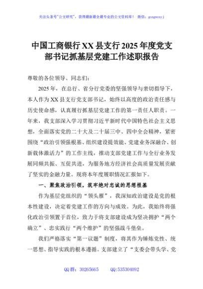 / 中国工商银行XX县支行2025年度党支部书记抓基层党建工作述职报告