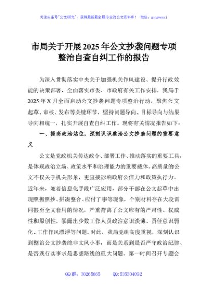 / 市局关于开展2025年公文抄袭问题专项整治自查自纠工作的报告