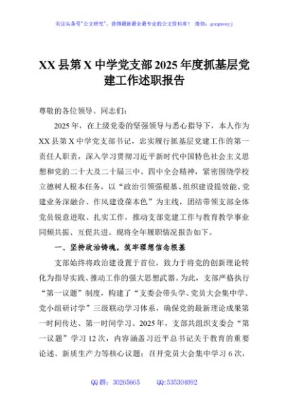 / XX县第X中学党支部2025年度抓基层党建工作述职报告
