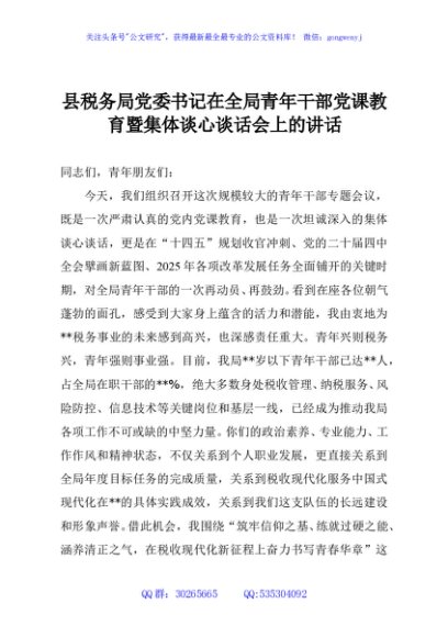 / 县税务局党委书记在全局青年干部党课教育暨集体谈心谈话会上的讲话