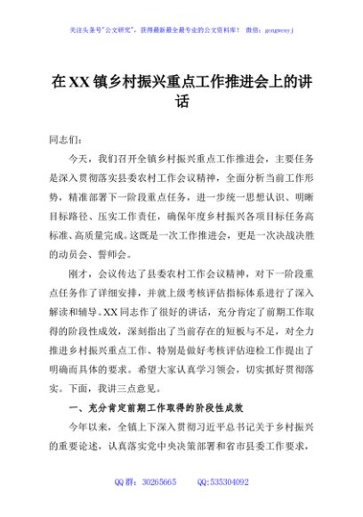 / 在XX镇乡村振兴重点工作推进会上的讲话