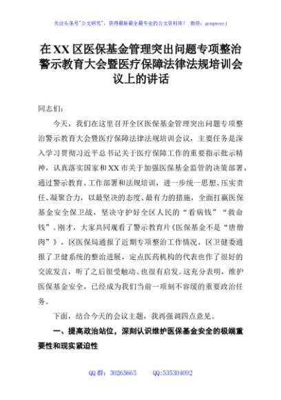 / 在XX区医保基金管理突出问题专项整治警示教育大会暨医疗保障法律法规培训会议上的讲话