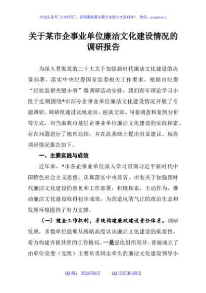/ 关于某市企事业单位廉洁文化建设情况的调研报告