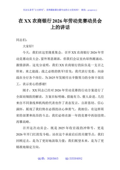 / 在XX农商银行2026年劳动竞赛动员会上的讲话